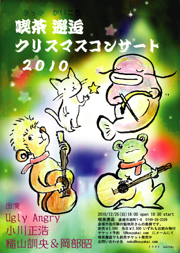 今年も開催、喫茶邂逅クリスマスコンサート。 今年の出演者 Ugly Angry 小川正浩 稲山訓央&岡部昭 すごいことになりそうです。 チケット予約はこちらまで。 座席に限りがありますので、お早めにどうぞ。